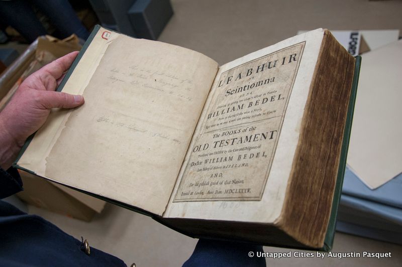 The American Irish Historical Society has 10,000+ volume library spread across several archive rooms. The Society calls it“the most complete private collection of Irish and American Irish history and literature in the United States.” Among the prized possessions is the first printing of the Bible into the Irish language, from 1685. There are also letters from the White House from Franklin Delano Roosevelt.