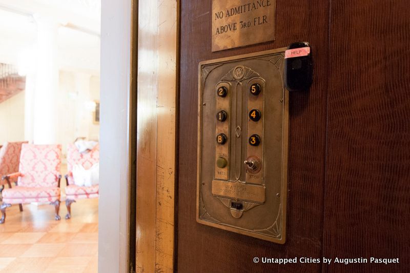 A Watson Automatic Elevator, installed in the building after its initial construction, has wonderfully vintage elements. This includes wood panels, a checkered floor, old-fashioned push buttons, a stop lever, and Art Deco signage. The elevator runs from the basement levels, where there is another library archives, to the first floor entry and AIHS office, to the fifth floor.