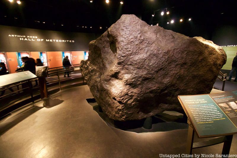 The largest meteorite in the Arthur Ross Hall of Meteorites is 34 tons…and supported by columns that reach through the floor and into the bedrock underneath the museum. The meteorite, called “Ahnighito,” is the largest on display in the world and came from a meteorite called Cape York that was about 200 tons and broke apart in the air about 10,000 years ago. It was discovered in Greenland in 1894.