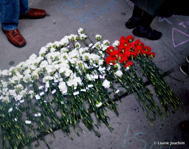 The names of the victims had been written on the sidewalk and there were 146 white and red carnations on the ground as well, making the number of dead that more real. Other flowers and wreaths were placed in front of the building, donated by unions and other organizations.