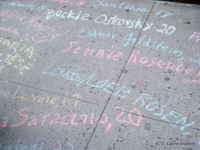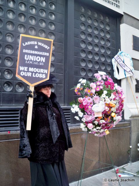 One woman came dressed in a period costume from the era. She was all in black and carried a union organizing sign. She was a bit foreboding, like a ghost from the past, a survivor of the fire. People were a bit scared of her, but kept taking her photo. She never said a word. She walked among the crowd and posed in front of the sign and the wreaths.