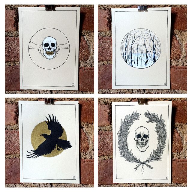 In addition to illustrating the Art of Style column, Kit Mills creates small, spooky, one-of-a-kind ink drawings. Skulls, birds, and plant life are frequent subjects, rendered in black and white ink with iridescent gold highlights that catch the light and shine. One of these would be a perfect gift for a person in your life who wears a lot of black and likes to visit cemeteries. Kit is also available to do custom commissions with the skulls, plants, creatures, and whatever else of your choice.