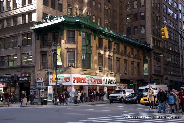 Websites like ScoutingNY and New York Press have all covered this little gem, but it’s always a pleasure to see it in person. It’s designed by Emery Roth, the same architect as the Central Park West San Remo apartments. According to New York Press, “in the 1930s it was a cigar store and later it was home to one of the gang members associated with the much-publicized “Capeman” killing in Hell’s Kitchen,” in recent years it was a sex shop and since 2010 it’s been a pizza shop, but the DVD lingerie shop still occupies a small portion of the storefront.