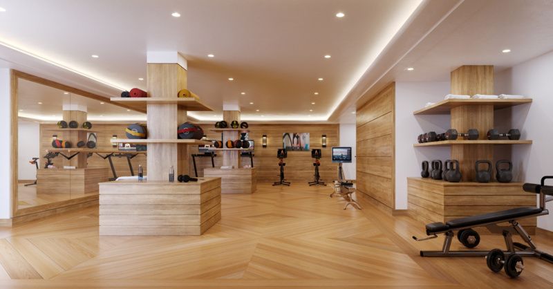 New features of the building’s lobby include coffered ceilings, custom moldings, and floors made from Bianco Estremoz and Grigio Nicola marble paired with Zimbabwe Black granite accents. Along the wall, antique mirrors reflect the custom brass chandelier, while a marble-clad decorative fireplace creates an intimate ambiance in the seating area. Amenities include a fitness center with Peloton, Hydrow, and NordicTrack equipment, as well as a pet spa, a grooming station, and private storage.