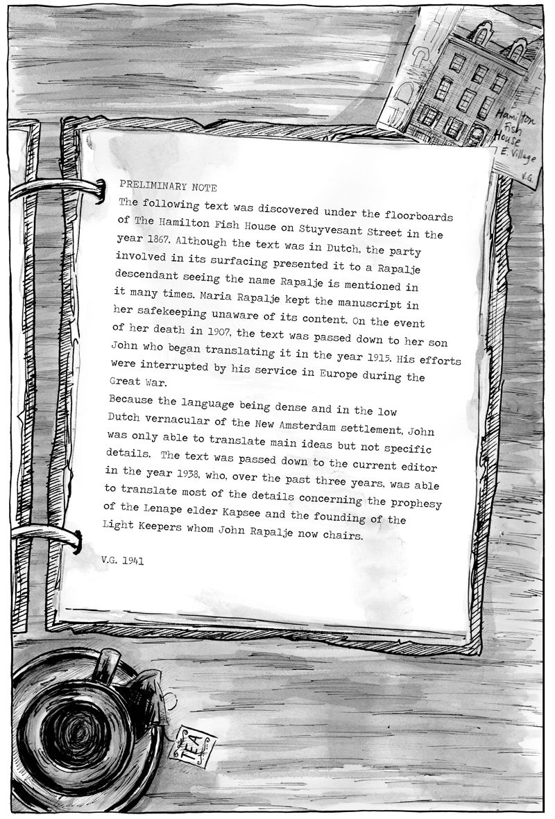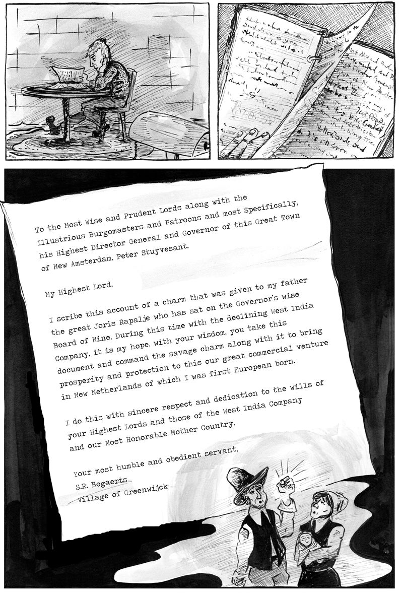 For the next few installments we’ll be delving into the pages of the Tovernboak itself as they’re being read by Owen. This week it’s front matter with an introductory letter written to New Amsterdam’s sixth Director General, Peter Stuyvesant, by Sarah Rapalje, whom we met in a previous installment. Her intention was to pass the Parelzaad and the account of what it did to Stuyvesant so he could protect the colony from the encroaching English. The following begins the account.