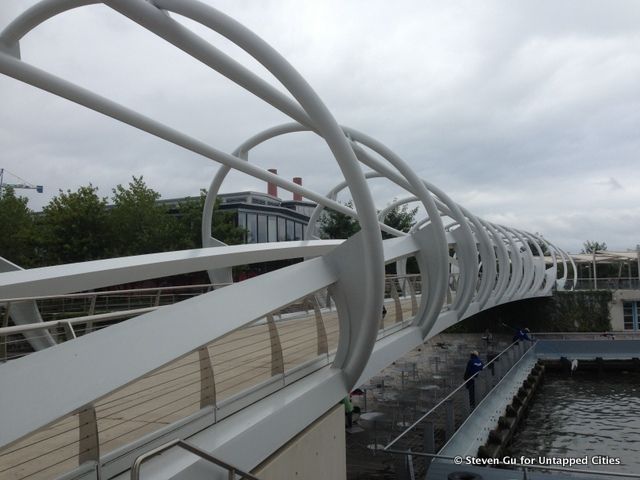 Although it was cloudy the day we visited, the park’s landscape design stood out of the gloom. The park’s bridge had twisted steel, arching and attaching itself to each end of the gap between pool below.