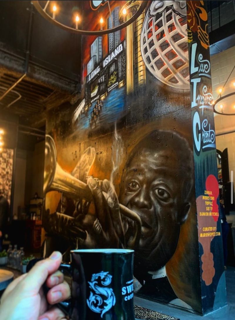 Sweetleaf Coffee Roasters is a place of music and coffee. The hand-painted mural at the center of the cafe features prominent musical artists and Long Island City pride. The walls of one seating area are covered in black and white artist portraits behind hanging frames of golden musical records. The shop currently has multiple locations and is known for their original coffee packets like their Cold Brew and Rocket Fuel. Sweetleaf makes their own coffee and what sets them apart is their mission to experiment and refine coffee beans their own way, with their own flavors. The dynamic and colorful ensign of the space is made to reflect their drinks and remind New Yorkers that coffee and music are central to the city’s identity. Sweetleaf’s old-world charm and dedication to punk, rock, jazz, and more genres of sound culminate into a multi-sensory experience where taste in music and taste in coffee are an equal priority.