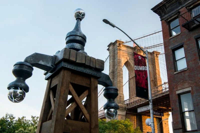 Fans of the video game “Clash of Two Clans” will be excited to hear that on Friday, the Builder “came to life” and created two sculptures in DUMBO! Bringing “his handiwork to the real world,” the Builder made an 18-foot-tall Tesla Tower and a statue of the warrior P.E.K.K.A. These pop-up sculptures at the entrance to Brooklyn Bridge Park will be there until today at 5PM, so if you have some time, head over there ASAP–it’s not everyday that a virtual character comes to life for New York City!