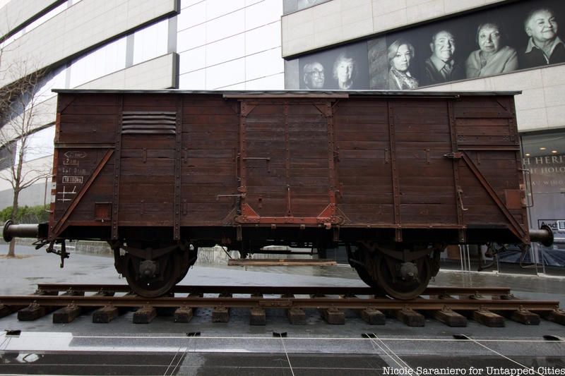 The Museum of Jewish Heritage in Lower Manhattan is marking the debut of its latest exhibit, Auschwitz. Not long ago. Not far away., with a poignant and striking visual installation. Standing outside the museum atop a short row of tracks is a red, World War II-era German freight car, a car similar to those used by German Nazis to deport people within occupied Europe to ghettos and extermination centers during the Holocaust.