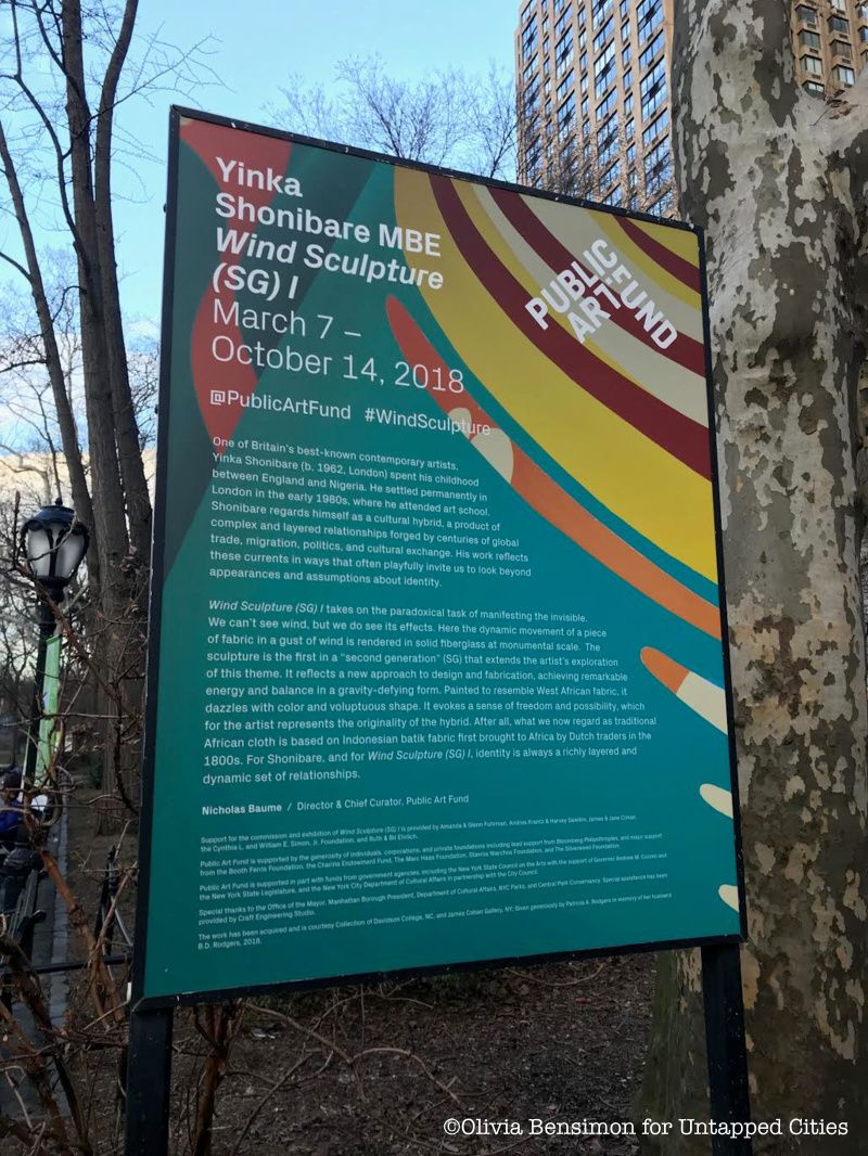 “Monumental in scale and imposingly sited on axis with the entrance to Central Park, Yinka Shonibare’s Wind Sculpture (SG) I assumes the aspect of a classical civic monument. However, its lithe and undulating form and its vibrant, colorful surface suggest a very different approach,” says Public Art Fund Director & Chief Curator Nicholas Baume. “This is one of his most abstract works, yet it still tells a story. Its patterned, fluttering sail suggests the geographical, cultural, and personal layers of a migration borne aloft on the cross currents of colonial history.”