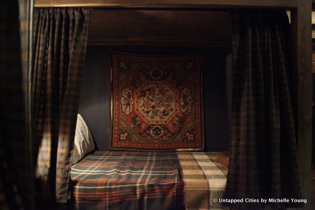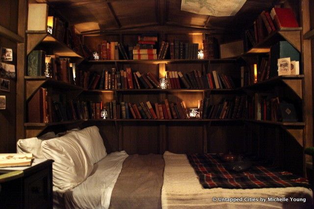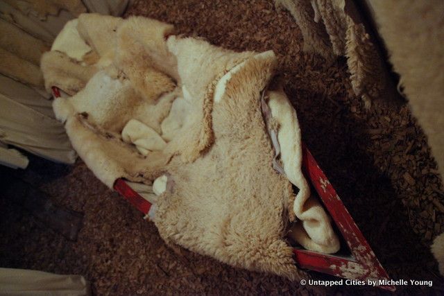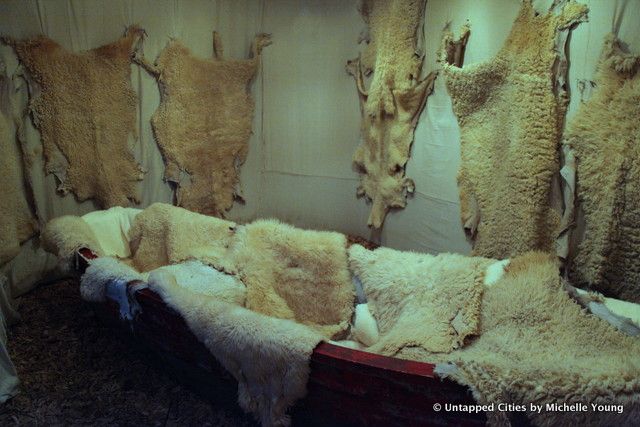 There’s a small bedroom also, with the bed surrounded to the ceiling on three sides by old books. A desk in the foyer is covered with books on plants and collected specimens. Letters and sheet music are tacked on to the wall, a cabin window looks out onto the incongruous New York City skyline. An outdoor patio area has a real fire burning, which doubles as a smoking area. Then through the wooded paths you’ll find a tent filled (and we mean filled) with sheepskins. There’s also a boat that’s filled with sheepskins.