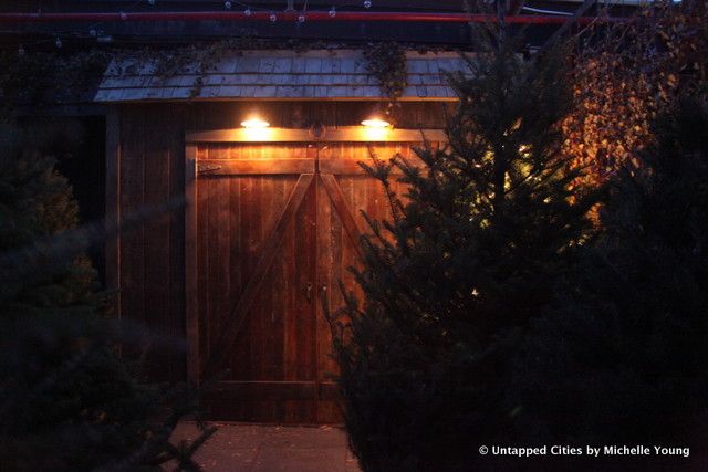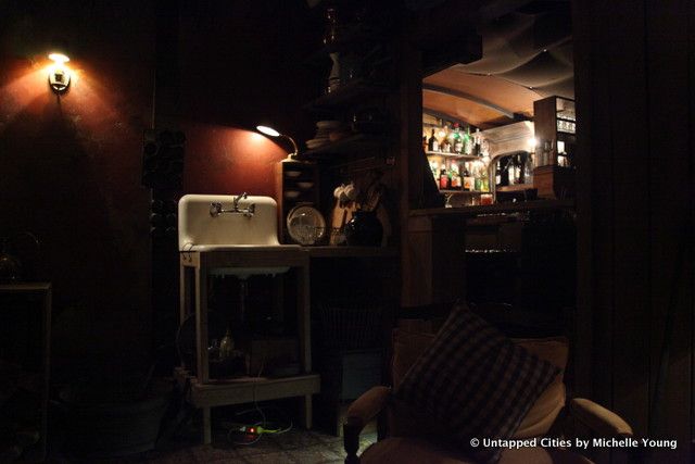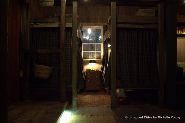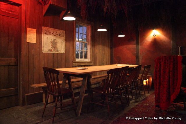 There are upwards of 50 Christmas trees surrounding the wooden cabin, with forest paths to explore. The cabin itself is expansive. The main room, whose doors are weighed down by tin cans, has two bunk beds (replete with hot water bottle and Scottish blankets galore), a fireplace, two sitting areas, a long wooden communal kitchen table, a small kitchen and the bar. Like Sleep No More, every single detail is thought through–including the layer of dust on top of the mantle. It’s almost like The McKittrick waited deliberately until the dust was just right before announcing The Lodge to the public.