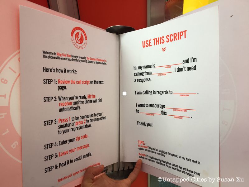 The booth was created through the #RingYourRep initiative to encourage activism and civic engagement among both hotel visitors and non-visitors, making it easier than ever to call your representative and voice concerns. All you have to do is pick up the phone, punch in your zipcode, select the representative you desire to speak with, and leave a message. To make civic engagement even simpler, The Standard is providing a script for phone booth users as a guide on how to speak your way to the congressional staffer on the phone. (For those who don’t know, the staffer is responsible for tallying up calls for and against legislation, which will shape how the senator or representative votes in Congress.)