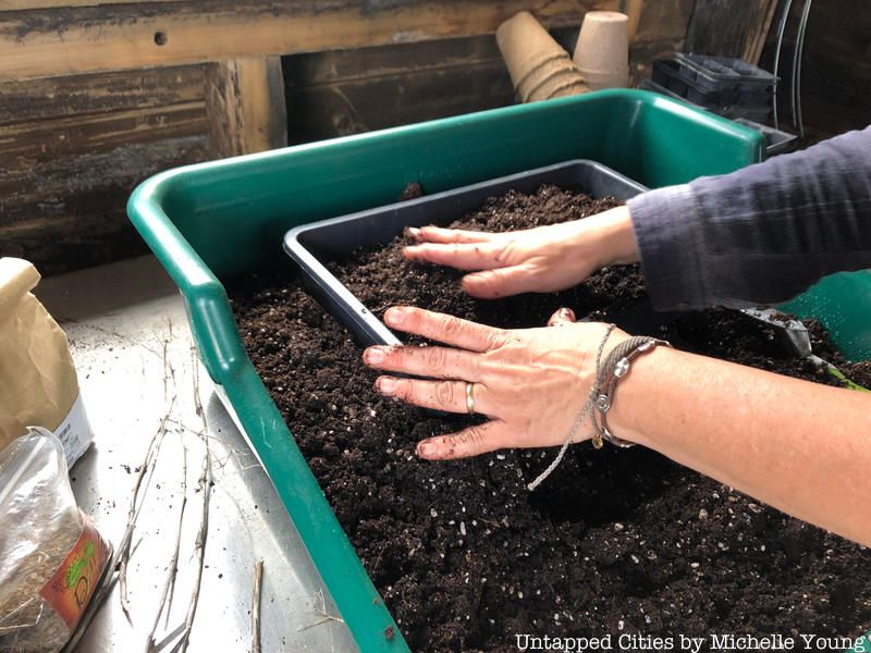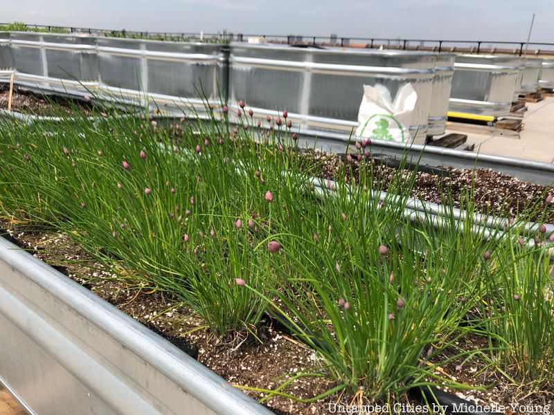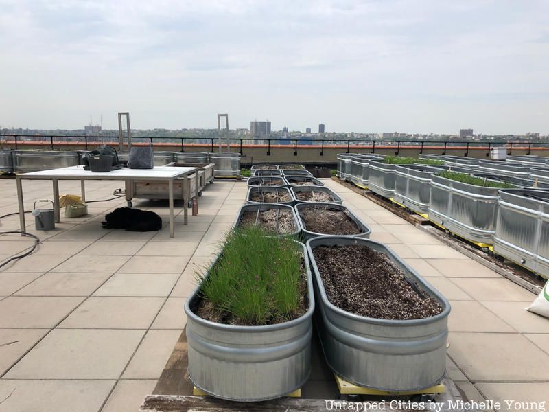 Last year was the pilot season of the garden at the Starrett-Lehigh and armed with those learnings, Denise is training building employees who volunteer how to care for the garden. There are rows of silver galvanized stock tanks that will be watered through an irrigation system that will be turned on around the second week of June. The larger tanks are filled on the bottom with recycled plastic bottles, through a partnership with Action Carting in the Bronx, giving a second life to the bottles as drainage. “Landscape fabric is put over the bottles so the soil above it doesn’t all wash away,” Denise tells us. All the soil is pesticide free and the seeds are sourced from local farms, “who specialize in open pollinated and heirloom varieties which are so important to save since we need diversity,” Denise tells us.