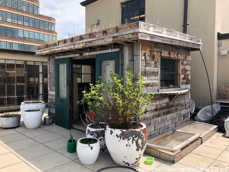 The shed was designed by Ralph Lauren, one of the many creative companies in the building, and built from wood repurposed from the Starrett-Lehigh Building’s rooftop water tanks, that were replaced. The cute shed will soon have a green roof!