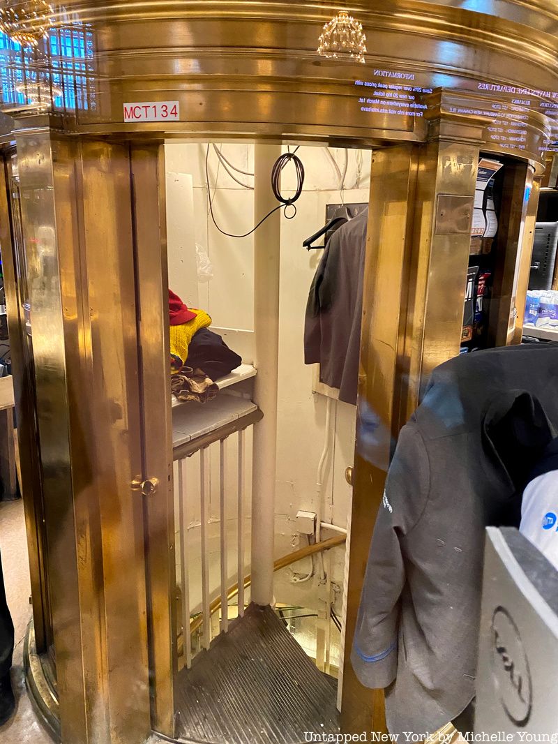 It is said that it’s a quick way for workers to go between levels, but in fact, before 9/11, there was no entrance to the kiosk on the main concourse level. After 9/11, the door was added in case of emergency. Besides the metal banisters, it’s pretty no-frills inside, and a photograph from the Epoch Times shows a worn down chair, a fan, a garbage can, and a portrait of Jesus.