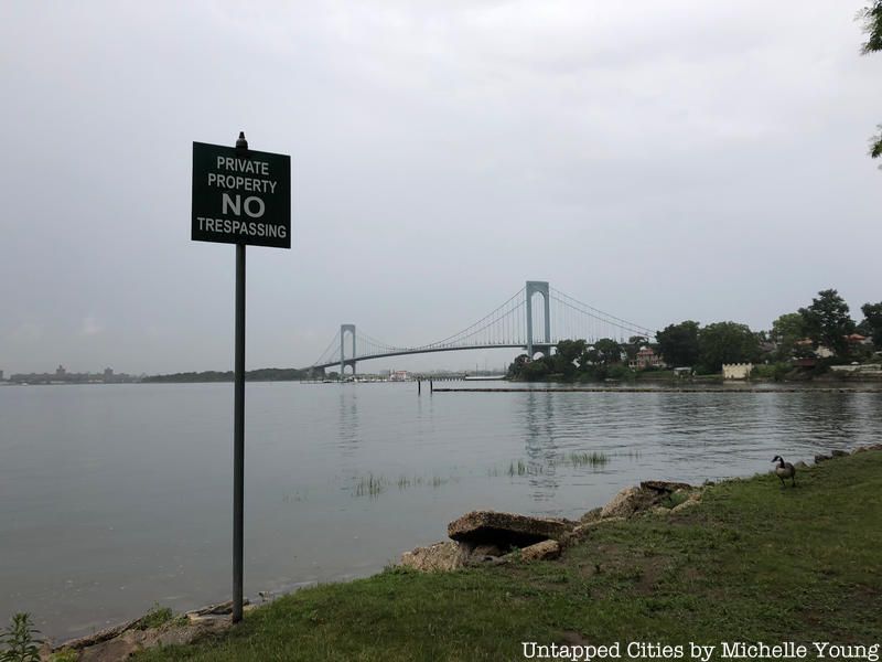 One of the oddest things about the waterfront stretch here is that it is completely privately owned by the Malba Association. A sign along the waterfront reminds visitors of this. The waterfront portion is its own tax lot (Queens Block 4416, Lot 18). According to the city’s records, the vacant waterfront land totals 99,900 square feet, in a strip 35 feet wide. The Malba website states that the developers “reserved title to the streets and to the entire waterfront as a protective reservation designed to preserve the unified character of the community.” The private access allowed the community to have a private beach, boat landing and pier, clubs and other amenities.