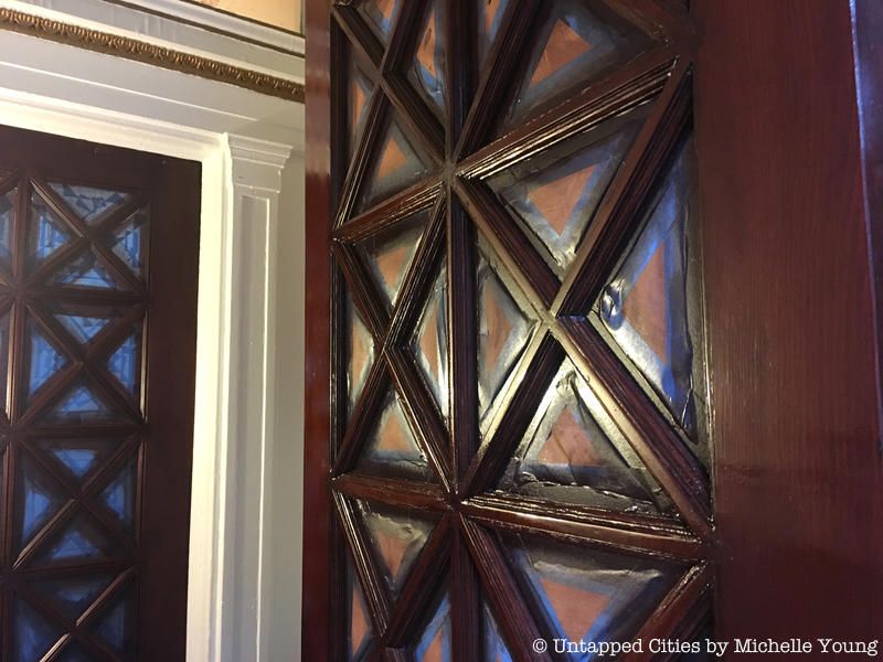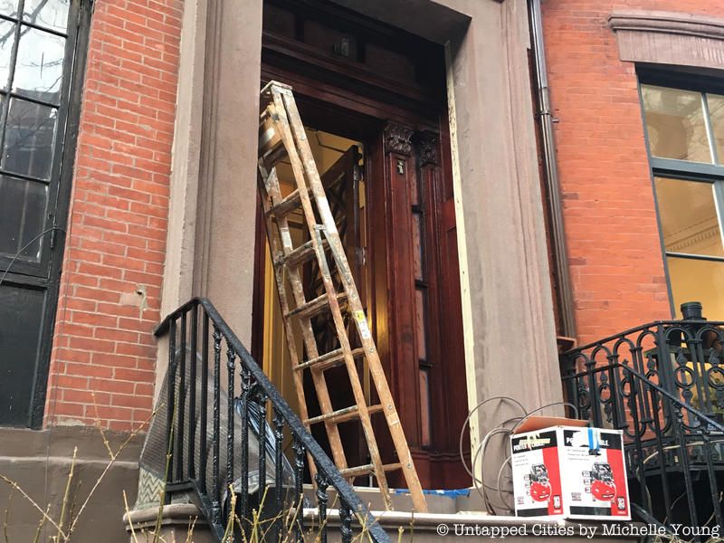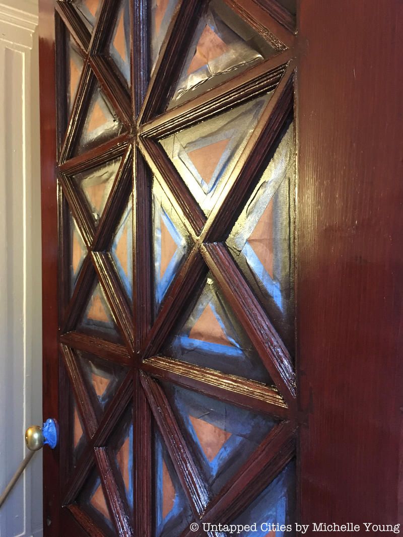 In addition to a strikingly ornate interior filled with colorful tapestries, carpets, and sculptures, there is a throne used only for the Dalai Lama, who has visited during his trips to New York City. Recently, the New York Landmarks Conservancy awarded a $3,000 matching grant to Yeshe Nyingpo, part of 17 Sacred Sites Grants given by the organization $279,500, to restore the double-leaf mahogany front door. Restoration work began almost immediately in the last week of January and on our visit yesterday, work was being done.