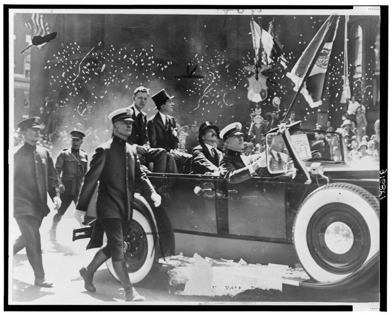 The year before, a ticker-tape parade took place for American Olympic Champion, Gertrude Ederle in 1926, after she became the first woman to swim across the English Channel. She also beat the records of five men who swam the channel before her. In 1928, New York City celebrated several other aviation records: one for Amelia Earhart’s transatlantic flight and a collective one for Captain Hermann Koehl, Major James Fitzmaurice, and Baron Günther Freiherr von Hünefeld for the longest westward transatlantic flight. Earhart would get another parade in 1932.