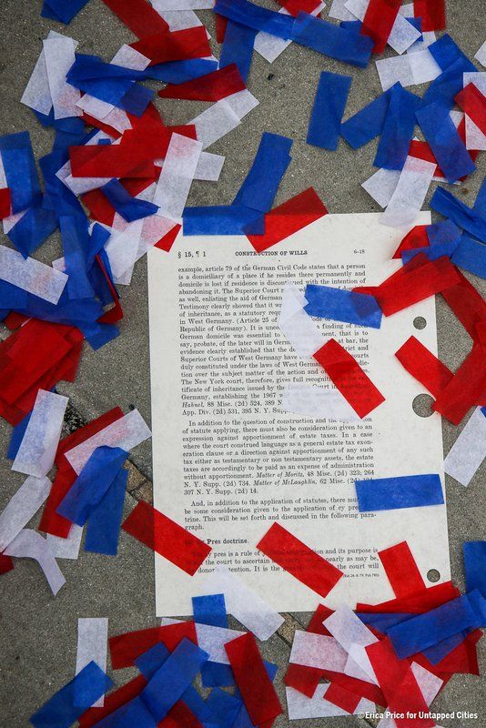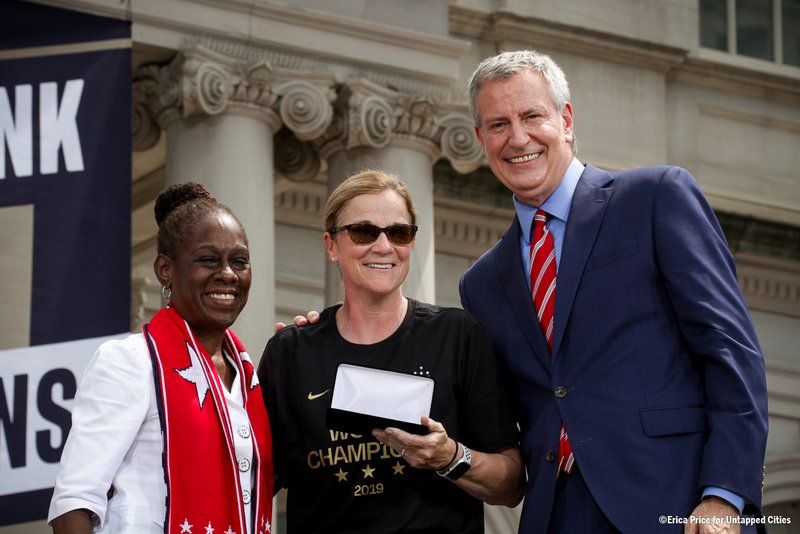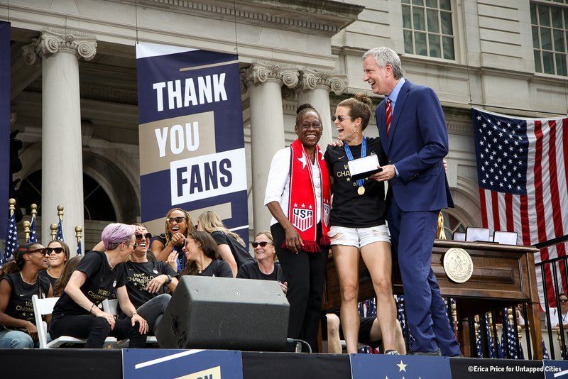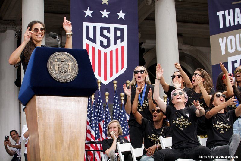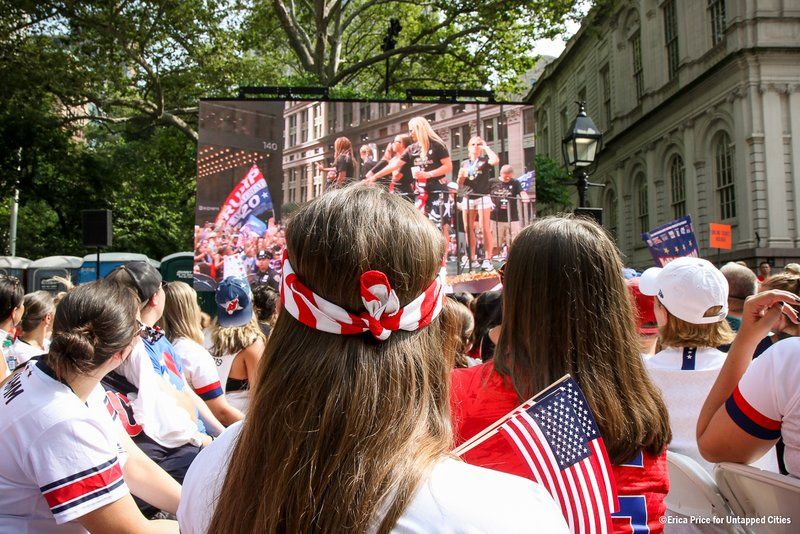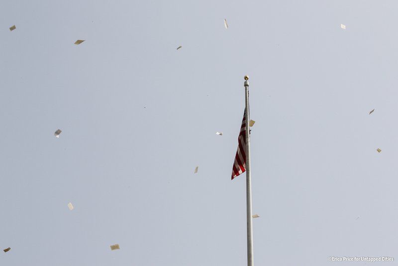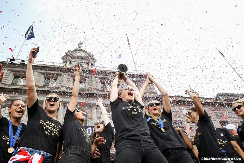 The term ticker tape comes from the paper strips that once showed the prices of stocks, and were thrown out of the windows of the buildings along Broadway during parades. But other bits of paper were thrown out the windows too: Laurie Gwen Shapiro writes in The Stowaway: A Young Man’s Extraordinary Adventure to Antarctica, which covers some of Admiral Richard E. Byrd’s three ticker tape, parades that “torn telephone directories, and adding-machine tape” were also thrown from the windows above. [Side note: Admiral Byrd holds the record for the most parades]. Ticker tape was such a part of contemporary culture that one of the grotesques inside the Woolworth Building lobby is holding a strip. At the 2019 parade for the US Women’s National Soccer Team, most of the “ticker tapes” were actually legal documents. The red and white ticker was blasted just for the ceremony at City Hall that followed the parade.
