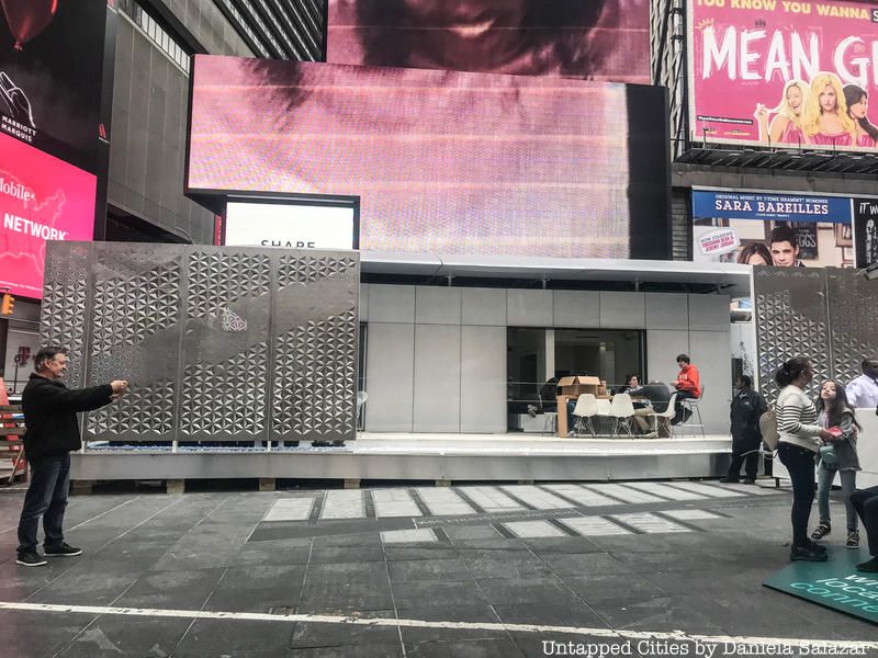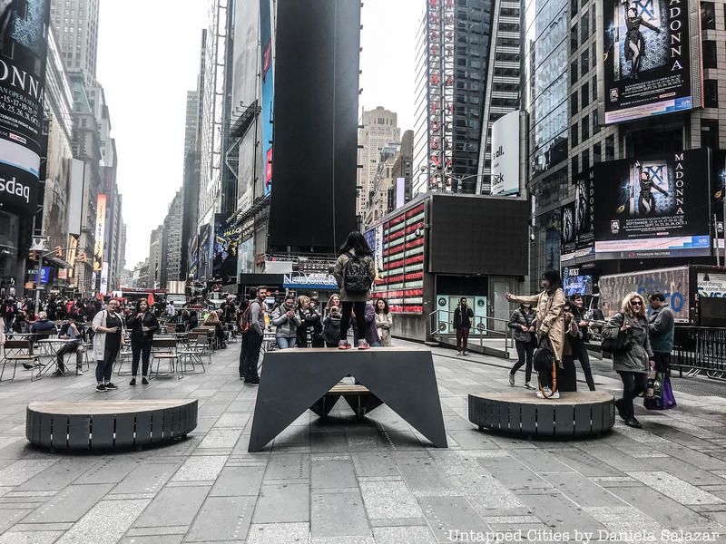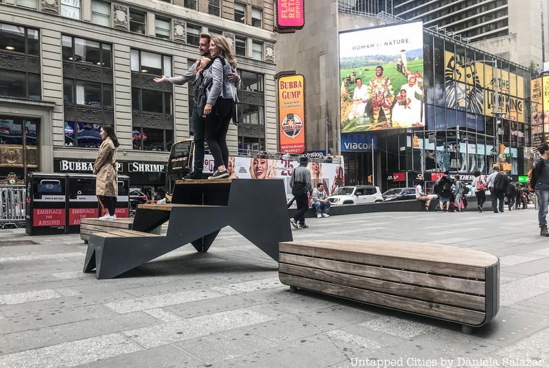 The Strand Bookstore kiosk is not a new addition to Times Square for NYCxDESIGN but the clever bench and bookcase just alongside it is from last year’s festival, designed by Hive Public Space and a product of the TSQ Design Lab. This year, new urban seating and furniture will be displayed as part of a new competition for a public-space furniture. Look at for the solstreet solar bench that allows for mobile charging and digital displays. These pieces of furniture were also getting a lot of public attention: