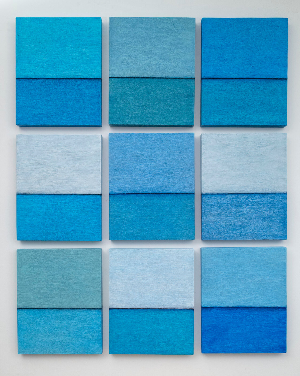Among ceremonial pieces like the baby naming chair, mezuzahs, menorahs, and a sculptural Omer counter, an advent-calendar type piece used to mark the 49 days between Passover and Shavuot, visitors will also see a series of Sky and Water paintings, perhaps Kahn’s most well-known works. These paintings feature a blue color known as Tekhelet in the Jewish faith, but this hue and the symbol of water have significance in nearly every belief system. There are also paintings inspired by flowers, a subject that recalls memories of an Ikebana floral arrangement class Kahn took at the Metropolitan Museum of Art with his maternal grandmother when he was a child. The works on view speak to universal human experiences both large and small.