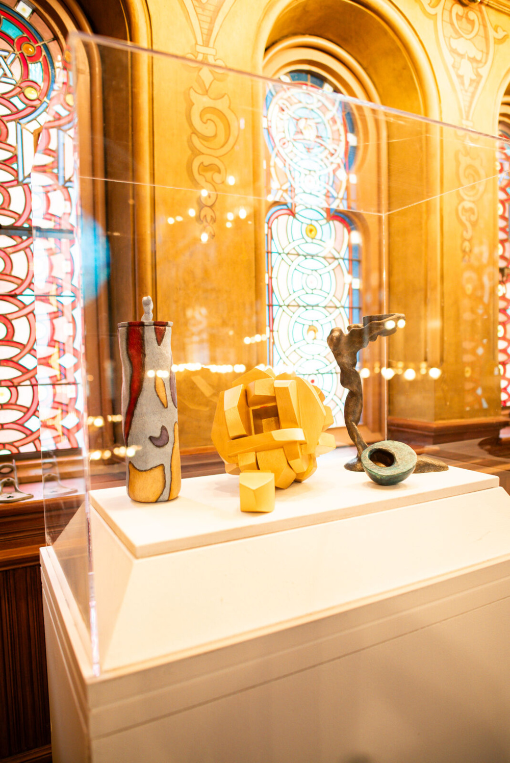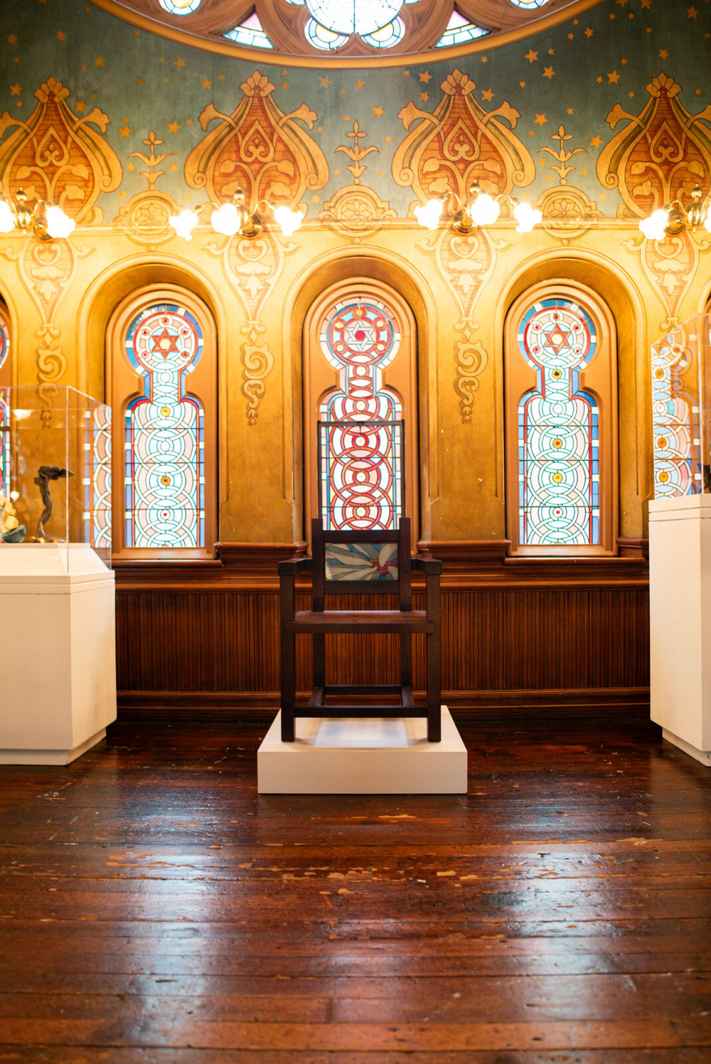 “The curator and I selected works that would enhance the space,” Kahn explains. For example, Kahn chose to set a baby naming chair he created opposite the magnificent sanctuary window by Kiki Smith. This chair wouldn’t be placed in that spot for an actual baby naming ceremony, but Kahn saw a beautiful relationship between the fresh start of a new life, which the chair represents, and the “gorgeous window, looking to the future.” Nearby, Kahn custom-built slender vitrines to fit more small ceremonial objects into the space. The artist meticulously measured the space available and used every inch available to its fullest potential.