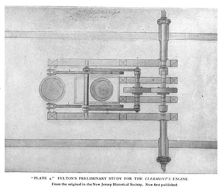 One of Fulton’s first sketches of the his North River Steamboat (Claremont) sketched while he was in France. Source: Robert Fulton and the Clermont.