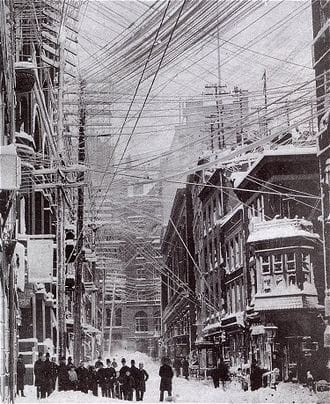 One of the biggest hazards in the aftermath of the blizzard was navigating the telegraph and electric wires. The blizzard had brought not only snow, but devastating winds of up to 84 mph, knocking over poles.