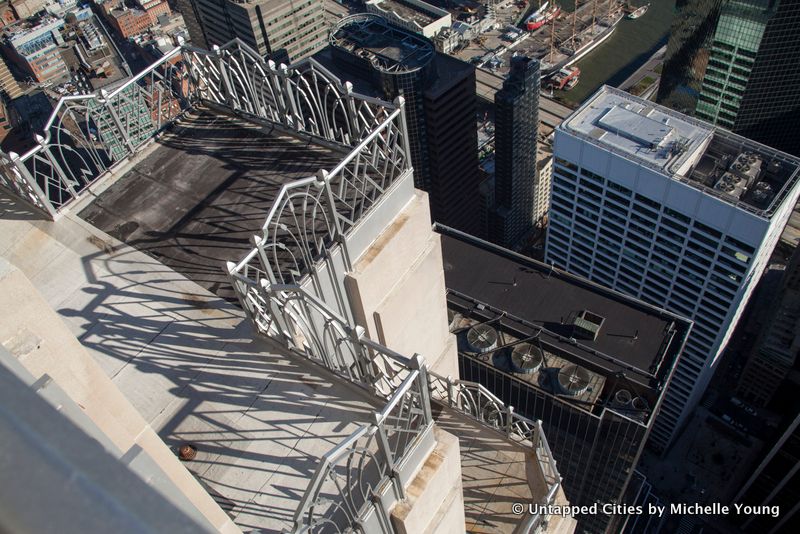 There’s also a small “jump” elevator used by just the top six floors of the tower – levels 60 to 66. When it gets to 66th floor observatory/lounge, instead of opening from a bank, it rises straight out of the ground. Think supervillain lair kind of stuff. In the unrenovated space today, you can still see the floor light indicator on the back wall and the Art Deco gates.
