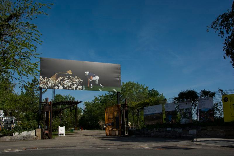 Because Socrates Sculpture Park is filled with unique artwork, it’s easy to overlook the 10 x 28′ billboard that greets visitors as soon as they enter the green space. Since 1999, it has served as a canvas for images that are installed once or twice a year. Artists utilize the space to set the context and tone for whatever show is on display.