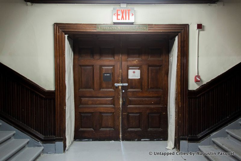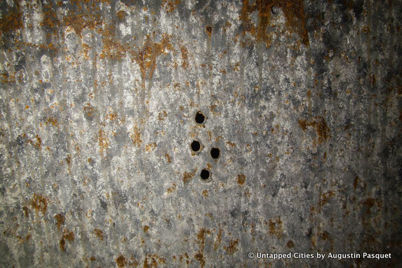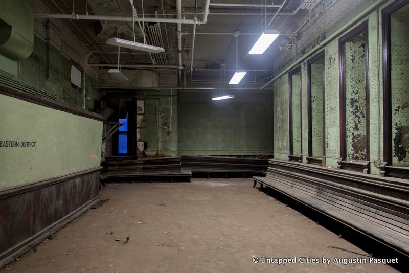 The militia of the 14th Regiment once used an extensive, multi-level shooting gallery below the building. The waiting room is an incredible sight to behold – green-tinged, tin walls and ceilings, with wraparound wooden benches. There was once a wooden railing in the space that is now located on the second floor of the armory, dividing the shelter from the rest of the building.
