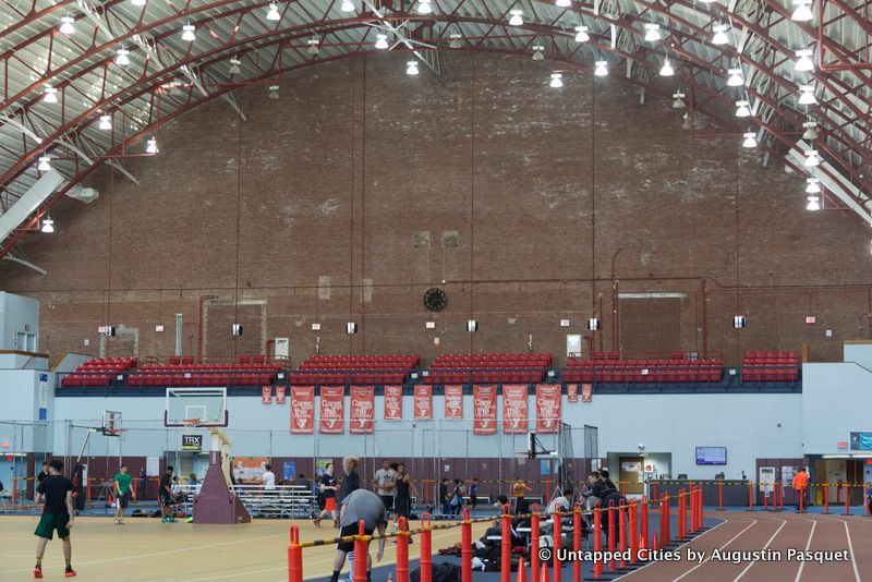 The Drill Floor today has a basketball court, running track and offices but you can see remnants of past use right before your eyes. Above the seats on the second floor, there are several bricked up openings. In the larger openings there were once staircases that led directly down to the drill floor. The smaller opening on the left was once a window for the commandants to watch the activity below.