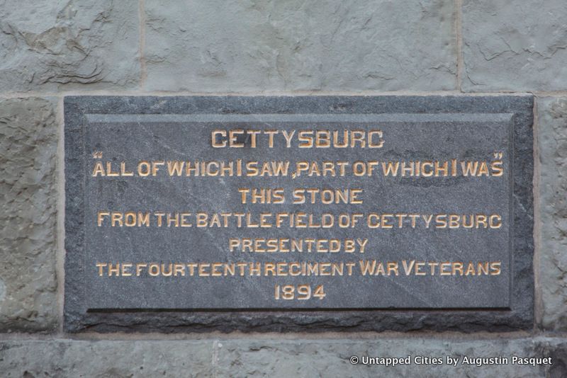 On the front facade of the Park Slope Armory along 8th Avenue is a stone from the battlefield of Gettysburg. The 14th was the only regiment that fought in all three days of the battle in Pennsylvania. The darker slate-colored stone is engraved with the words “Gettsyburg. ‘All of which I saw, part of which I was.’ This stone from the battlefield of Gettysburg presented by the Fourteenth Regiment War Veterans. 1894.”