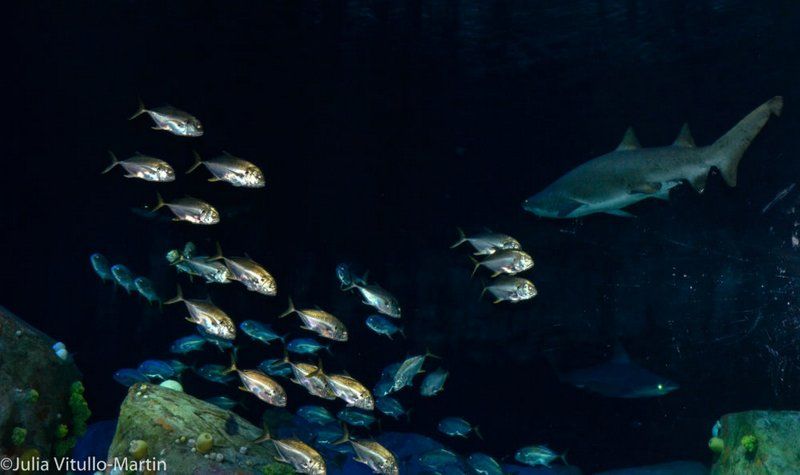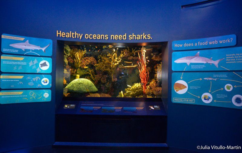 We feed them extremely well, says Dohlin delicately. Fed 180 pounds of herring, squid, and capelin weekly, the sharks have little incentive to search for their own food among the schools of lovely small fish swimming among them. Plus, quite a few of the small fish are bony, and therefore not that tasty to sharks. Still, in a post for WCS Vourderis notes that his favorite sandbar shark, Malcolm, likes to swim through “very cautious jacks.”