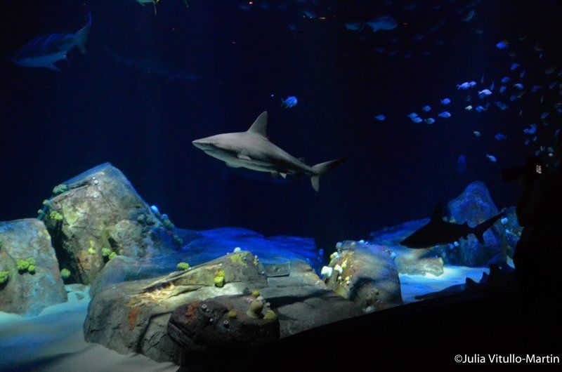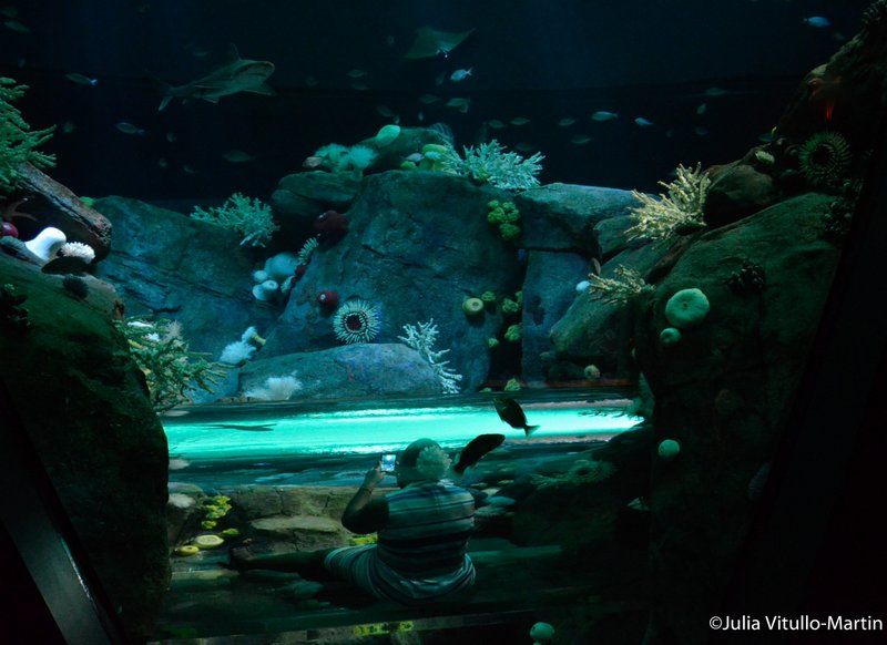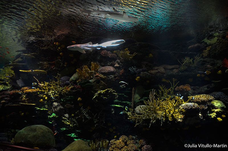 Visitors can walk or sit in the immersive, underwater Coral Reef tunnel, which allows them to view sharks swimming overhead.