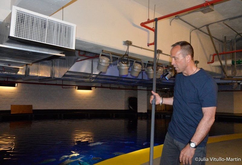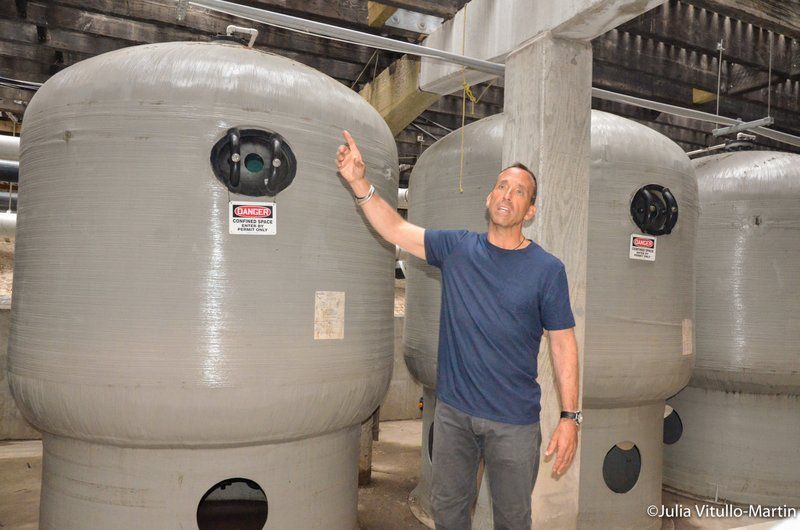 Jon Dohlin explaining the Aquarium’s new hurricane-combatting technology, standing in front of sand filtration tanks