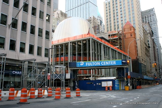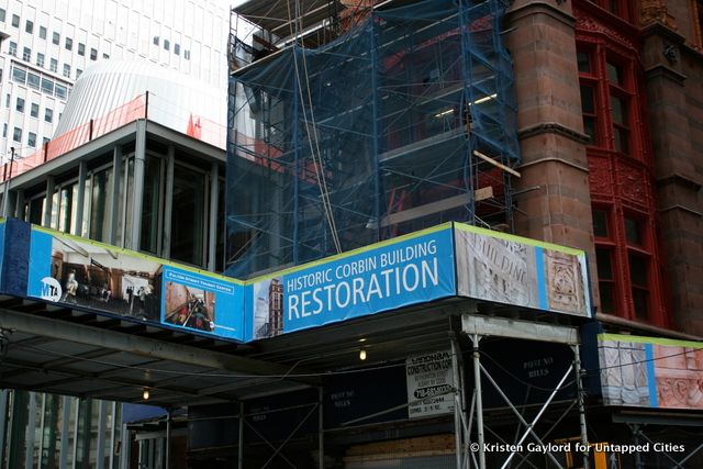 Back aboveground, we took a moment to mourn the demolished Singer Building at the current location of One Liberty Plaza. But nearby is cause for celebration: the Fulton Center construction has brought renewed attention to the Corbin Building, as it will serve as an entrance to the transit hub on the ground floor, and the exterior and interior are being conserved.