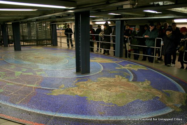 Heading underground at the Chambers Street and Park Place A/C and 2/3 station, we stopped to look at Oculus (1998), an Arts for Transit installation by Andre Ginzel and Kristin Jones. The diverse eyes of three-hundred New Yorkers accompany straphangers throughout the passageway between the subway lines, leading to a 20 x 40 foot mosaic that overlays the map of New York and the map of the world.