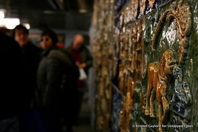 Other early 20th century terra cotta examples, such as these at Fulton Street, have repeatedly been preserved by the MTA during construction. Sometimes earlier layers of the station’s history are highlighted, as they are at 14th Street-Union Square, other times they are matched with modern continuation of the old mosaic patterns, as they are at Fulton Street. Either way, the MTA has shown an impressive appreciation of maintaining the subway system’s history, even as large projects like Fulton Center are undertaken. Joe reminded us of the “unnaturalness” of underground travel in the early years of the subway, and how scared some New Yorkers would have been to venture underground for extended travel. The Beaux-Arts ornamentation beautifying the stations was a way to make them hospitable, comforting and impressing the city’s commuters.