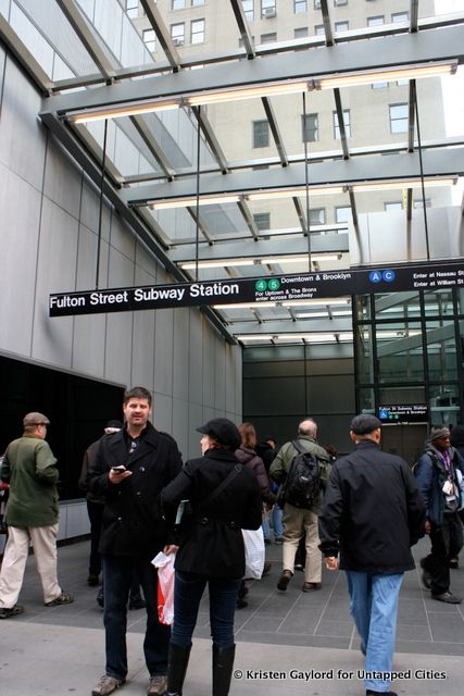 We then headed underground. Joe wanted to show us the downtown underground route that will soon be possible, when construction on the World Financial Center passageways and Fulton Center is finished. New Yorkers will be able to travel by foot from Chambers Street and Church Street to the intersection of John Street and William Street. Remember that next time it’s cold outside! It will be possible to meander from the World Financial Center to Fulton Street and William Street near South Street Seaport. Developers and the MTA are in the midst of creating a sort of subterranean mimic of the city above.