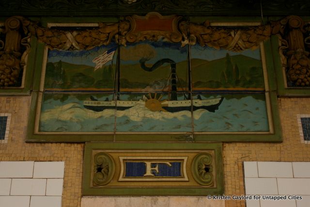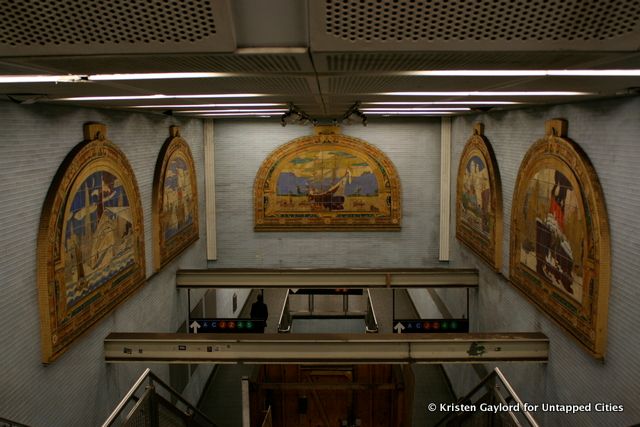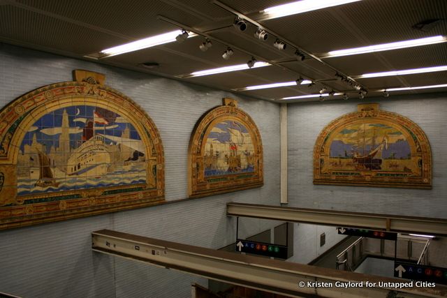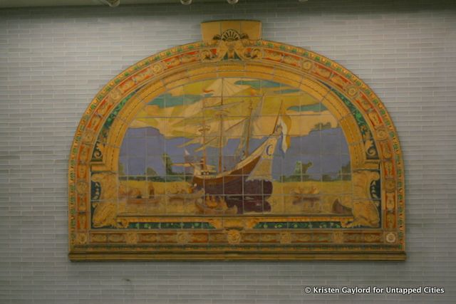 Up the stairs then down again and straight forward, we eventually came to Frederick Dana Marsh’s Marine Grill Murals (1913). The murals, which celebrate New York as a port city, were originally created for the McAlpin Hotel on 34th Street, and were entrusted to the NYC Landmarks Preservation Commission when the building was being renovated in 1989. In 2000 some of the murals and the hotel’s iron grille were installed by Arts for Transit in the Fulton Street/Broadway-Nassau passageway, until they were removed in 2009 for construction and reinstalled at the Williams Street entrance in 2011.