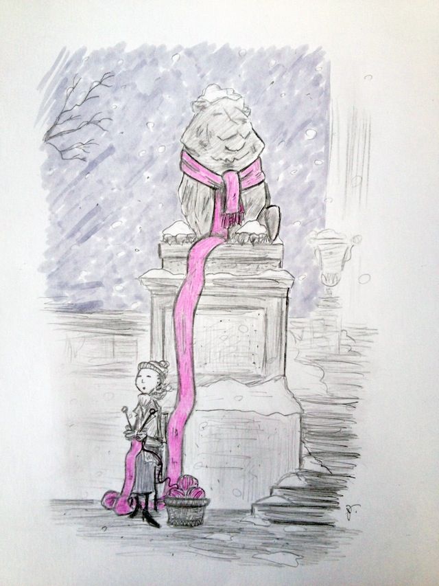 On his last visit to New York, in February, David was inspired by the winter weather and the way New Yorkers react to it. He drew this illustration—never before published—outside of the New York Public Library.