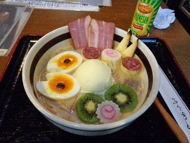 What do you think is most unappetizing about that photo of coffee ramen? If you guessed the container of parmesan cheese, we’re on the same page. Though, let’s give it the benefit of the doubt, after all, coffee ramen counts kamaboko (steamed fish cake), banana, salami, ice cream and eggs among its ingredients. The broth was coffee, and the noodles (which can be bought in packages at the restaurant), were also made of coffee. I thought it was at least edible, and at most, worthy of a trip report.