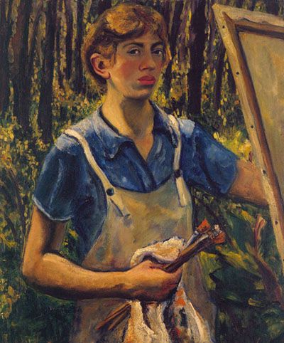 In her 1930 self-portrait, Krasner looks directly at the viewer, hostile and, like Lewis, aloof. She’s giving no quarter. She’s wearing the clothes of a working artist, a blue shirt and a heavy canvas apron. She’s holding her tools, brushes and a rag, in her right hand, while her left disappears into a painting she doesn’t show us. She’s not inviting anyone in. This was 15 years before she married Pollock, and she was clearly her own woman.
