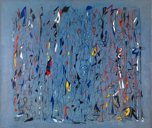 Norman Lewis (1909-1979), an African American whose parents emigrated from Bermuda, grew up in Harlem and studied drawing and commercial design in high school, before joining the merchant marine, notes the exhibit catalogue. Lee Krasner (1908-1984), born in Brooklyn to a Russian Jewish immigrant family, studied at Cooper Union and the National Academy of Design. Both were involved in the Federal Art Project of the Works Project Administration, Lewis as an artist, and Krasner supervising a section of its mural division.