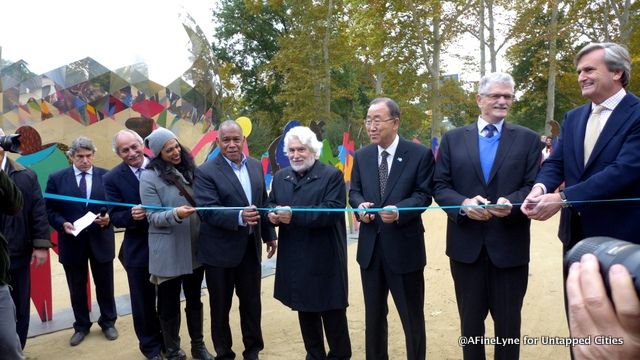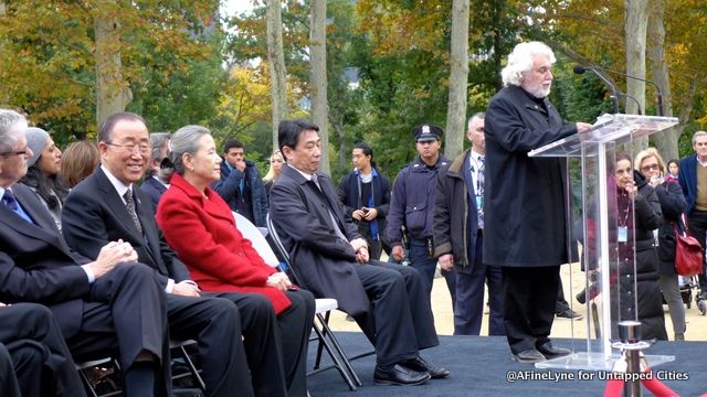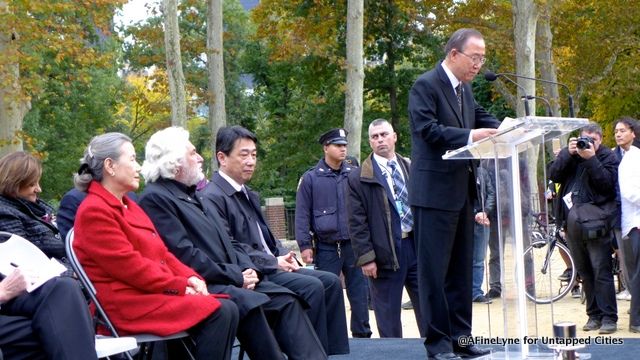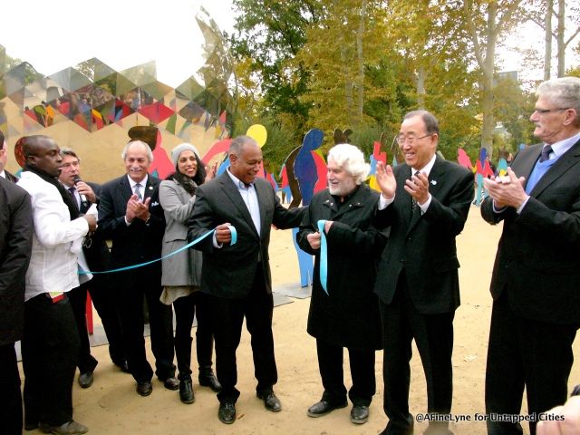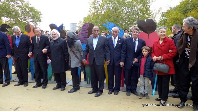 Over one hundred people were in attendance for the celebration and ribbon cutting including UN Secretary General Ban Ki-Moon and his wife Madam Yoo (Ban) Soon-Taek, NYC Commissioner of Parks and Recreation Mitchell J. Silver, President of the UN General Assembly Morgens Lykketoft, the artist Cristobal Gabarron and others.