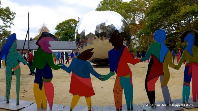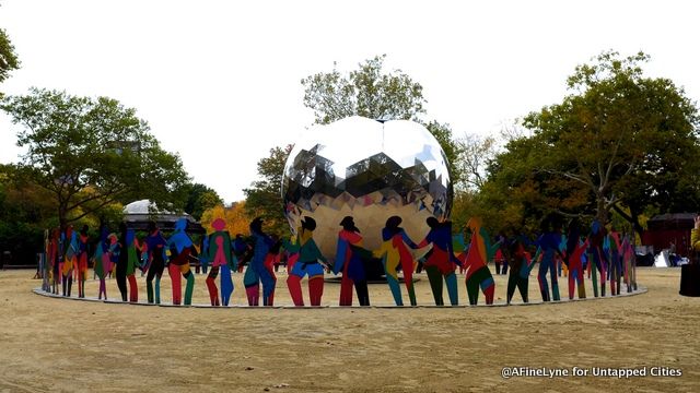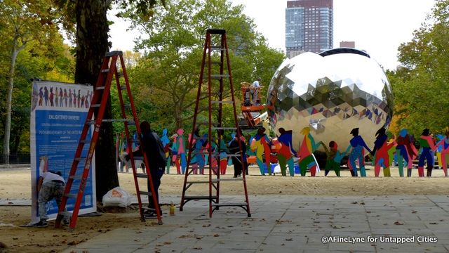 On Saturday, October 24th, the United Nations celebrated its 70th Anniversary by unveiling artist Cristobal Gabarron’s sculpture, Enlightened Universe, in Central Park’s Rumsey Playing Field. The large-scale, colorful interactive installation includes a twenty-four ton, stainless steel sphere with faceted mirror finish, surrounded by a spiral of seventy life-size figures – one for each year that the United Nations has been in existence.