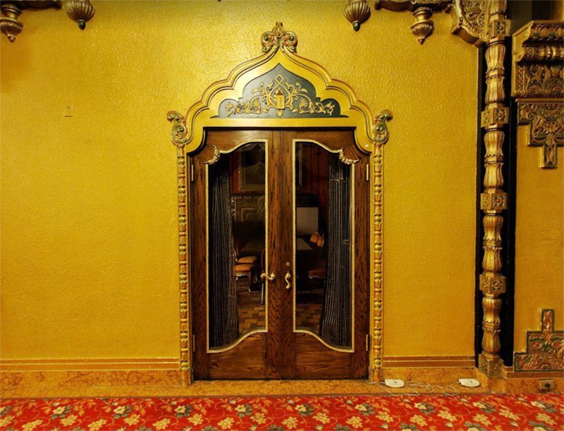 In the lobby of the theater, you can still see (and ride) the original 1930s elevator. Recently restored, the elevator has a bright red paint job with gold accents. Above, the ceiling is painted blue with twinkling stars. The old-timey elevator still requires an operator and is available for use only upon request.