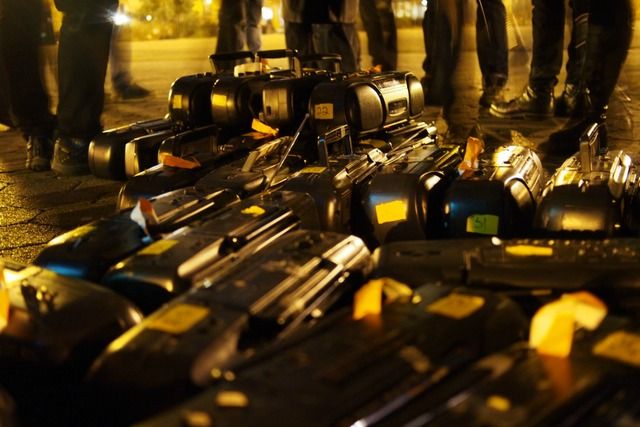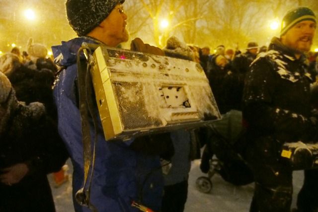 Participants start playing their devices simultaneously, then walk the carefully chosen route through the city’s streets, creating a unique mobile sound sculpture, which is different from every listener’s perspective. Kline will hand out a limited number of vintage boomboxes from his collection, and cassettes and CDs for those who bring their own players, though many people now use smartphones with portable speakers at the annual event. Each participant gets one of four tracks of music and, together, these comprise Unsilent Night.